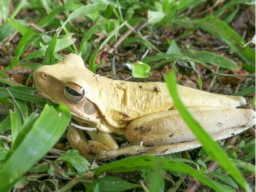 アルピノカエル発見かと思ったら目は赤くないのでこういう種類なのでしょうか? それとも変色個体でしょうか? どなたかこの種類を特定できる方おられましたら教えてください。 スマホカメラで撮影。 パラグアイの植物園の池の畔で発見しました。 個室もシェ…