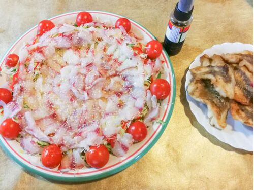 庭のプールで養殖しているティラピア。 大きいでしょう! これはたぶん2世か3世で、1世だともっと大きいのもいます。 ティラピア 増えすぎて困っているので、どんどん食べなくてはいけません。 日曜のお昼はティラピアづくしでした。 カルパッチョとバターム…